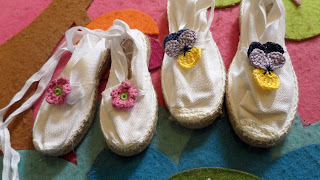 Este año he comprado unas zapatillas de esparto (tipo "costalero") para las niñas... no, no os asustéis, que no las vestiré de costaleras... les he puesto unas florecitas! ya están listas para cuando el buen tiempo se instale definitivamente!